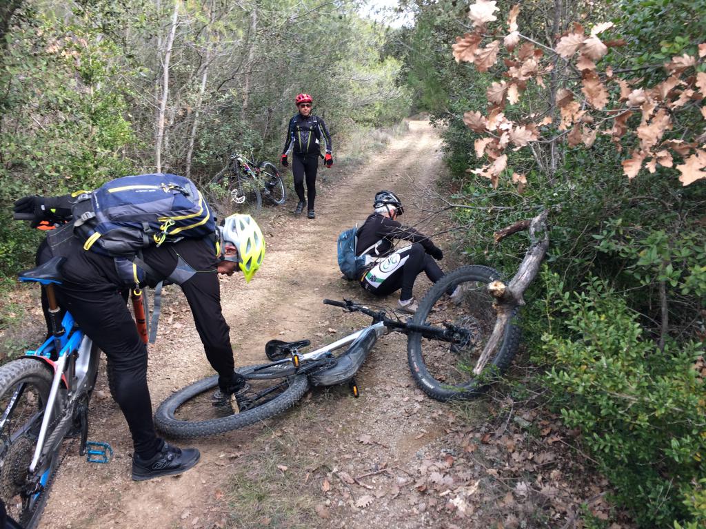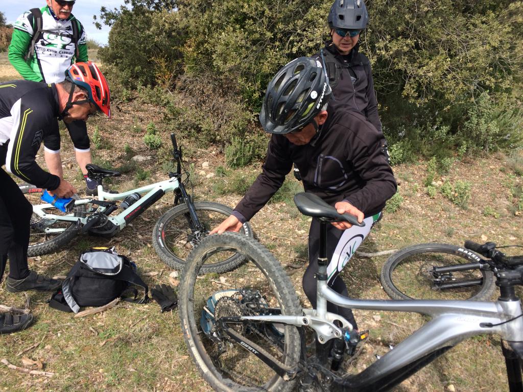 Plus de peur que de mal et nous voila reparti mais que pour quelques kilomètres seulement car Philippe trouvant que son vélo faisait un drôle de bruit découvre que la branche avait cassé 2 rayons. Un peu de bricolage et nous voilà reparti pour un super petit single dans les "escaires" de 4 kilomètres se terminant par quelques passages un peu techniques que certains ont dû passer à pied.