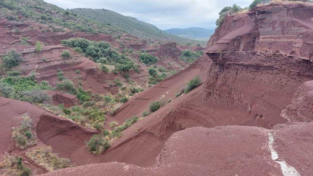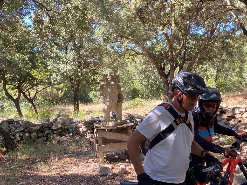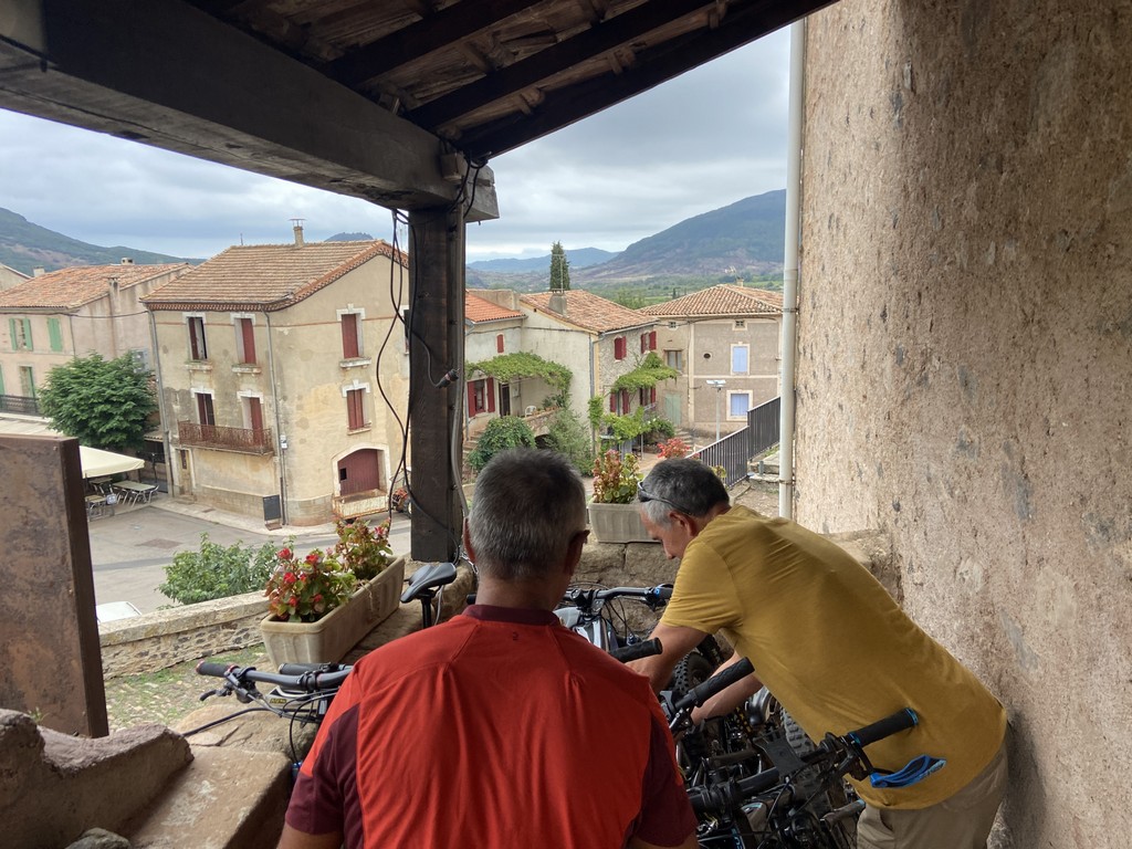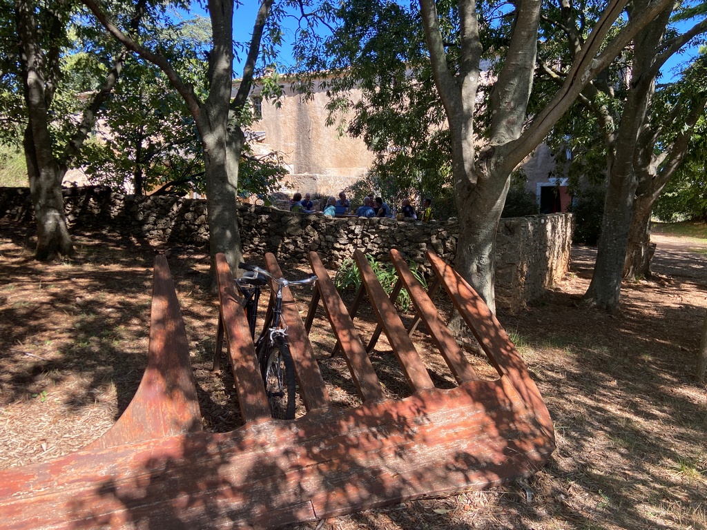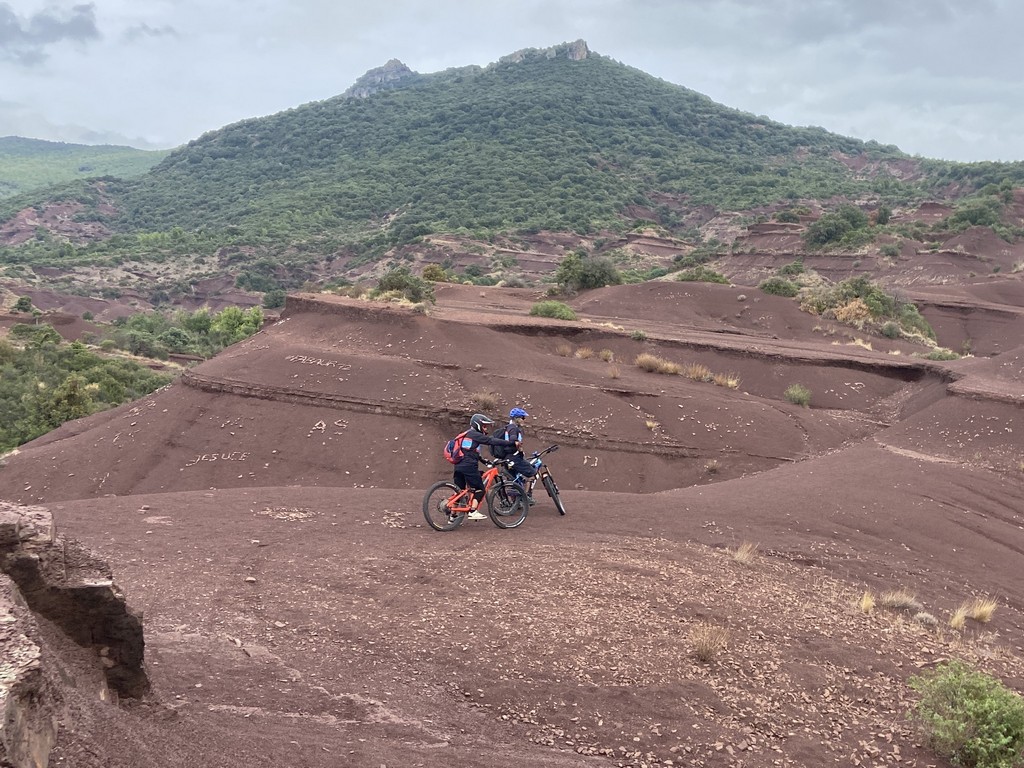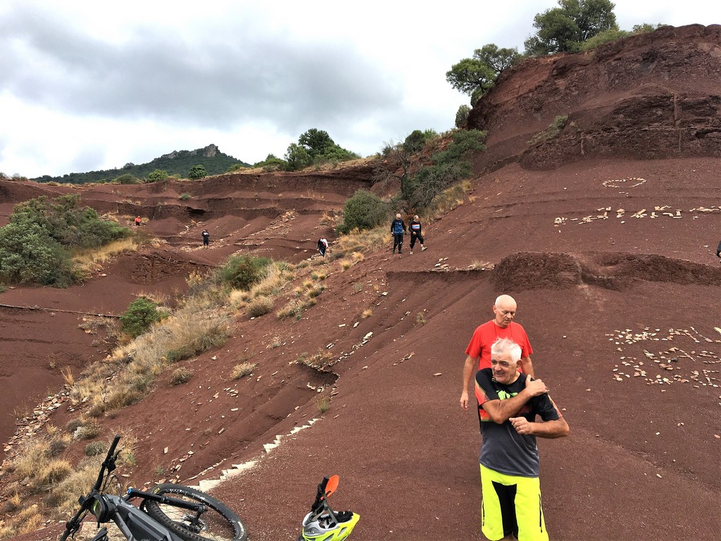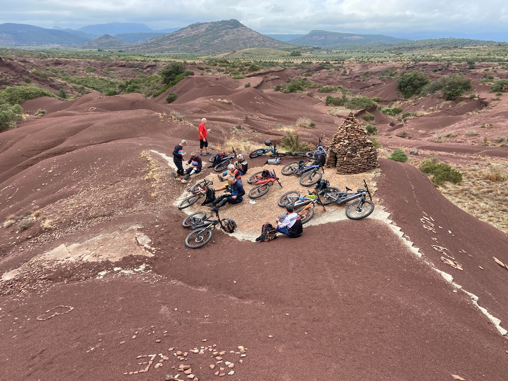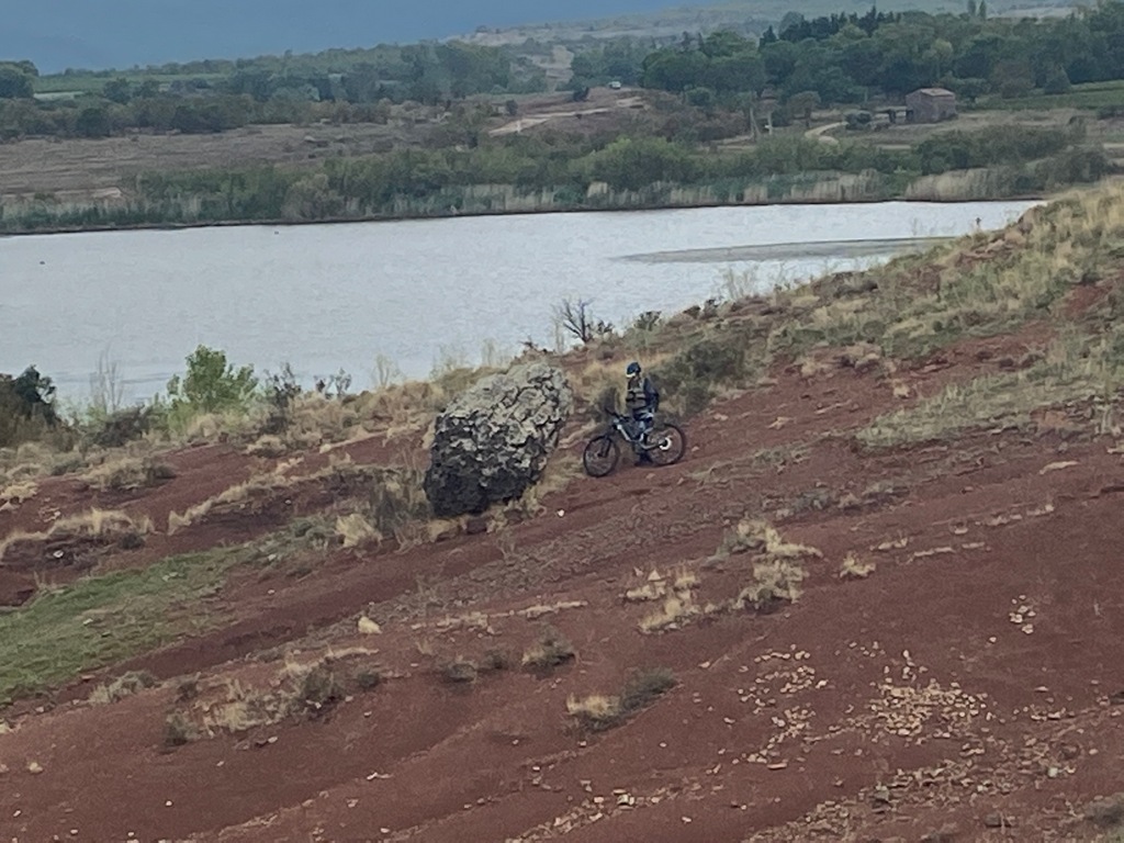 Départ des Pennes Mirabeau le 12 au matin arrivée Octon vers 15H. nous prenons nos vélos destination le Lac de Salagou pour un parcours de 38.48 KMS et 788 M de dénivelé positif. Première partie impressionnante, une montée accompagnée d’une multitude de cailloux, puis une descente identique, technique qui nous mènera au lac du Salagou. Composé de terres rouges appelé localement « Ruffe », classe de roches sédimentaires dont les éléments ont un diamètre de 0,0625mm. Matière qui a de grand pouvoir d’adhérence au sol. Nous longeons ce lac, sous un ciel couvert et bas mais sans pluie, nous arrivons au village de Celles dont la population a été exproprié lors de la construction de ce lac car le village devait être englouti à la construction du barrage du Salagou (dans les années 50) rivière du même nom qui a permis avec les pluies provenant des monts et des plateaux culminant à 300 m à l’Est 407 m à l’ouest et 530 m pour le Mont Liausson au sud de le remplir. Le niveau du lac est à 139 m (projet initial 150 m) avec une profondeur de 50 m et un volume d’eau de 102 millions de m3. Notre balade continue par des tentatives de variantes malheureuses mais avec un plaisir immense de découvrir cette région.