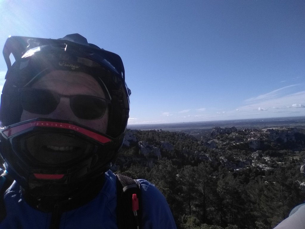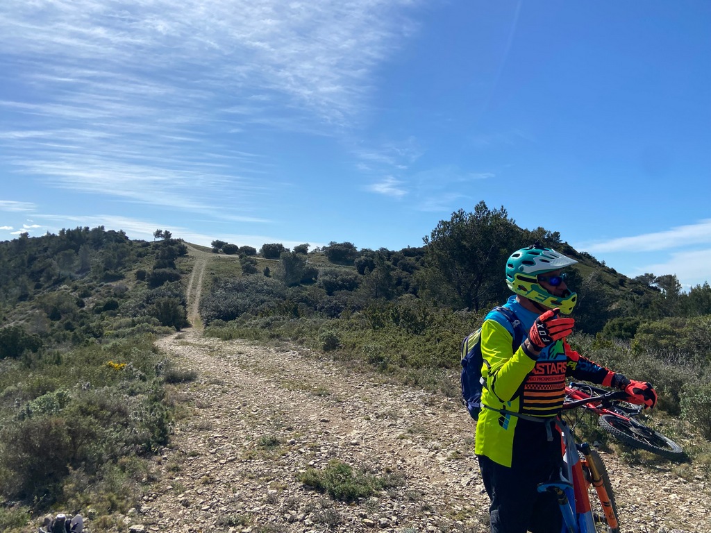 Ensuite nous avons pris un petit single puis un petit raidillon avant de redescendre par un single sympa vers la D27A qu'on traverse pour prendre une piste qui monte vers le massif de Baumayrane pour atteindre le point de vue sur le village des Baux.