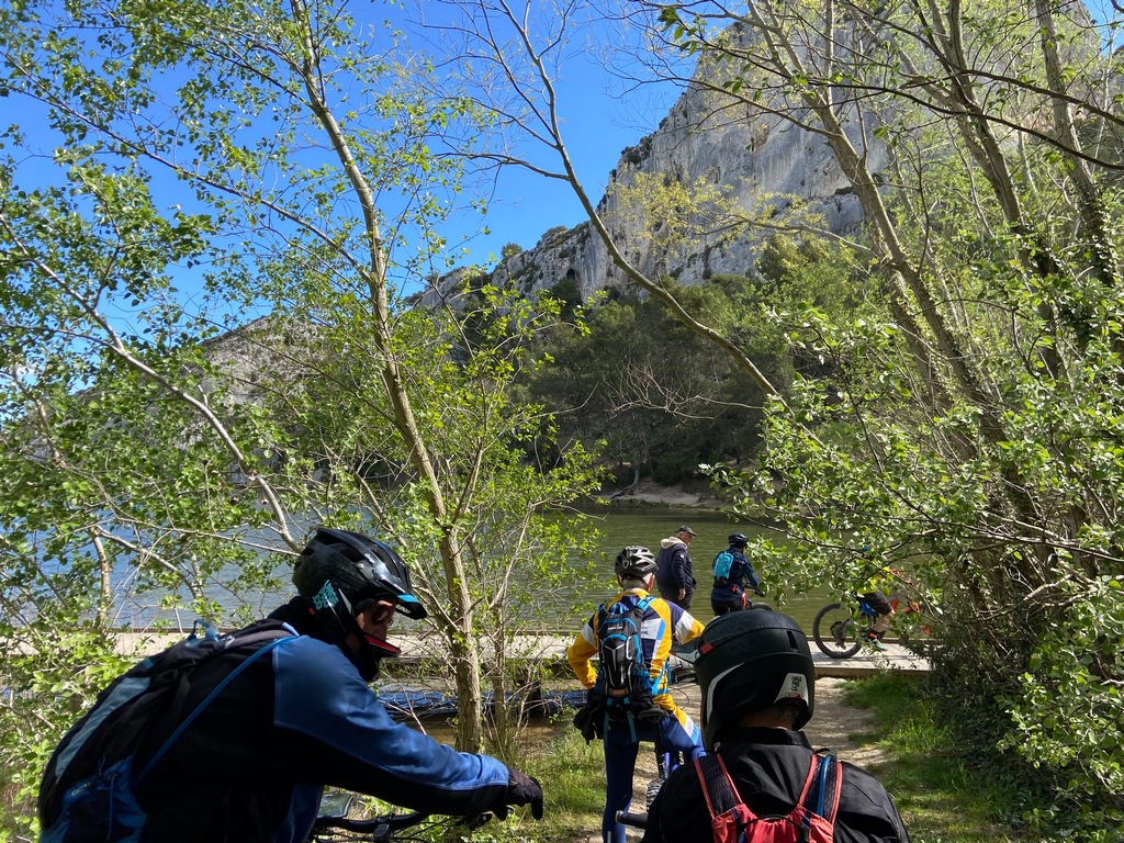 En haut, nous avons aperçu le groupe Route Sport en plein effort dans un col sur la D5 de là nous sommes redescendus par le vallon de Pierre Malle avant2023 04 15 12 16 VTT Les Baux LL 23 de retraverser la D5 pour aller découvrir un petit lac provenant d'une ancienne carrière.