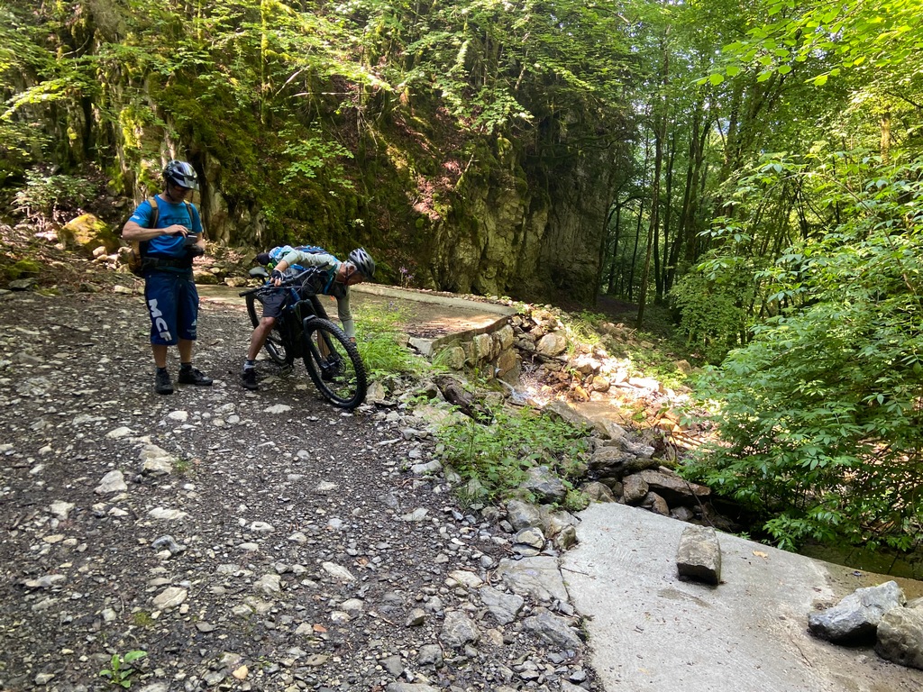 l'Est du lac d'Annecy jusqu'à Vesonne où on a laissé la route pour attaquer la piste forestière avec un fort dénivelé; sur 3 km on a fait 450m de dénivelé avec un arrêt près de la cascade pour récupérer un peu et faire la pause banane (Celle-ci a été fatale pour Philippe qui en redémarrant s'est rendu compte que son vélo était à plat, mais en regonflant cela a tenu: ouf!).